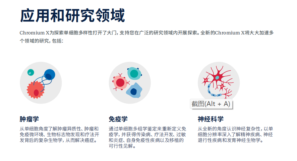 Chromium X 可以轻松处理各种项目,从试点研究到最高通量的分析。Chromium单细胞产品能够从多个角度捕获细胞活性的分子水平信息,包括基因表达,染色质可接近性、细胞表面蛋白、免疫克隆性,抗原特异性以及CRISPR扰动筛选。